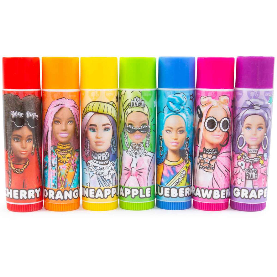 The Barbie Extra Lip Balm Set includes a fabulous assortment of seven fun flavors, each designed to offer something unique: