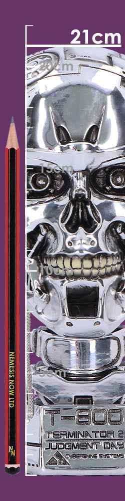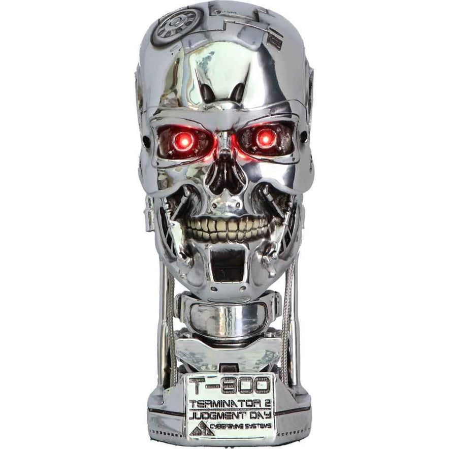 This officially licensed T-800 Terminator Light Up Figurine from Terminator 2: Judgment Day is a 21cm display head featuring a hand-painted metallic skeleton with battery-powered LED red eyes and a glowing skull!